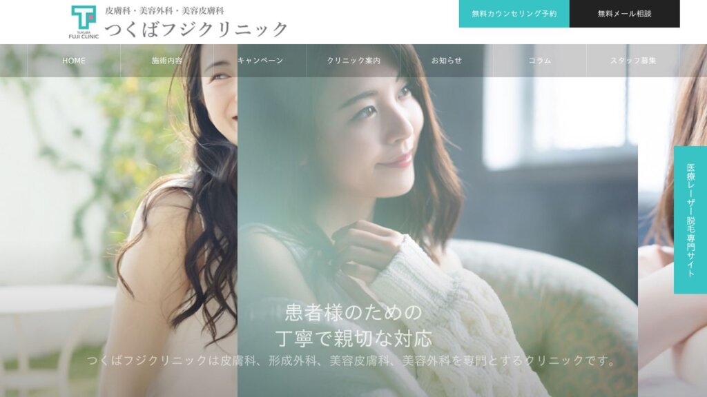 つくばフジクリニックでは、顔のエラ部分へのボトックス注射による施術を提供しております。施術にあたり、医師による丁寧なカウンセリングを通じて、ご希望やお悩みについてお伺いし、ご納得いただいた上で進めてまいります。完全予約制となっており、オンラインでのご予約も受け付けておりますので、ご都合の良い時にご相談いただけます。また、プライバシーに配慮した環境で対応しておりますので、安心してご来院ください。アクセスはつくば駅より徒歩4分です。
