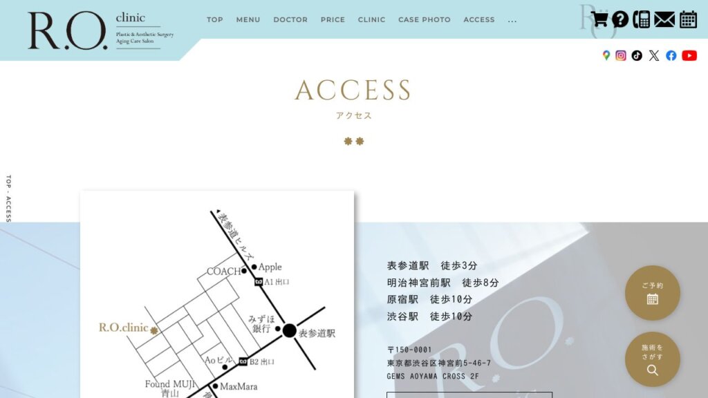 R.O.clinicでは、顔のエラ部分へのボトックス注射による施術を提供しております。施術に際しましては、医師による丁寧なカウンセリングを通じて、ご希望やご不明な点についてご相談いただける体制を整えております。ご予約はオンラインからも受け付けており、完全予約制を採用しておりますので、落ち着いた環境で施術を受けていただけます。また、プライバシーに配慮した対応を心がけております。アクセスは、原宿駅より徒歩2分、明治神宮前〈原宿〉駅より徒歩3分、表参道駅より徒歩4分となっております。