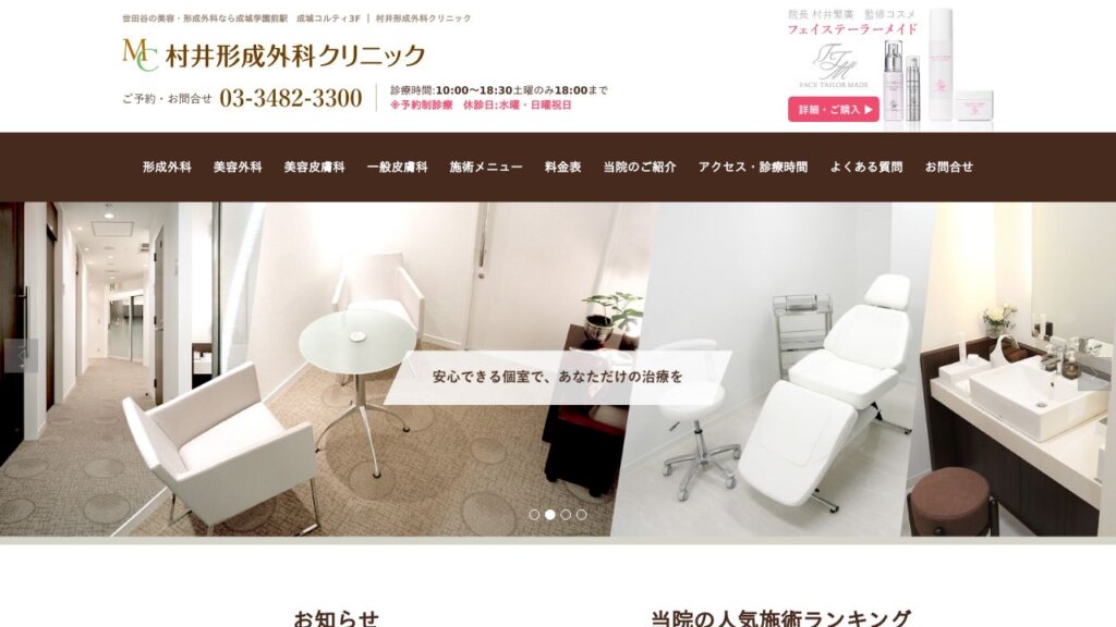 村井形成外科クリニックでは、顔のエラ部分へのボトックス注射による施術を提供しております。施術に際しましては、医師による丁寧なカウンセリングを行い、患者様のお悩みやご希望について詳しくお伺いし、ご納得いただいた上で進めてまいります。ご予約はオンラインからも受け付けており、完全予約制となっておりますので、待ち時間なくスムーズにご案内が可能です。また、プライバシーに配慮した環境で対応しておりますので、安心してご相談いただけます。成城学園前駅より徒歩2分というアクセスしやすい立地で皆様をお待ちしております。