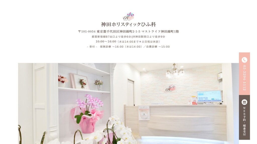 神田ホリスティックひふ科では、顔のエラ部分へのボトックス注射による施術を提供しております。施術に際しては、医師による丁寧なカウンセリングを行い、患者様一人ひとりの状態に合わせたご相談を承っております。ご予約は完全予約制となっており、オンラインでの受付も可能ですので、ご都合に合わせてお気軽にお申し込みいただけます。また、プライバシーに配慮した環境で診察や施術を受けていただけるよう努めております。アクセスは、新御茶ノ水駅より徒歩1分、神田駅より徒歩2分、小川町駅より徒歩3分、淡路町駅より徒歩4分、御茶ノ水駅より徒歩5分と、複数路線からご利用いただきやすい立地でございます。