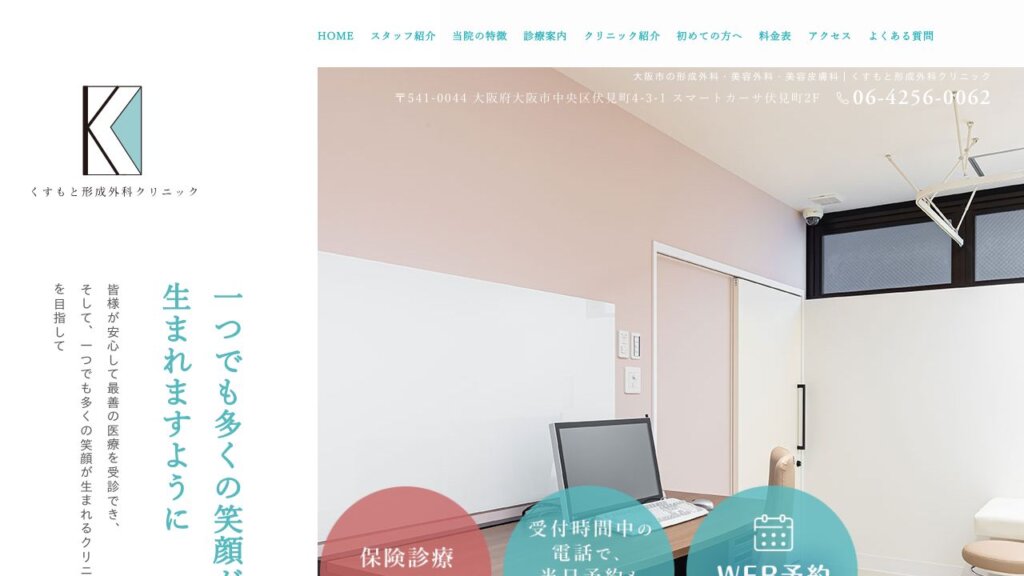 くすもと形成外科クリニックでは、咬筋へのボトックス注射による施術をご提供しております。施術に際しましては、医師による丁寧なカウンセリングを行い、ご相談を承っておりますのでご安心ください。ご予約はオンラインからも受け付けており、完全予約制のため、待ち時間なくスムーズにご案内できます。また、プライバシーに配慮した環境で施術を受けていただけます。アクセスは淀屋橋駅より徒歩1分、大江橋駅より徒歩2分となっております。