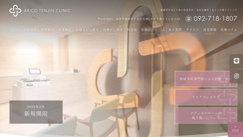 天神形成外科クリニックでは、顔のエラのボトックス注射による施術を提供しております。施術をご検討の際には、医師による丁寧なカウンセリングを通じて、お一人おひとりのご要望やご不安について詳しくお伺いし、ご納得いただいた上で進めてまいります。ご予約はオンラインからも受け付けており、完全予約制を採用しておりますので、待ち時間なくスムーズにご案内いたします。また、プライバシーに配慮した環境で、安心してご相談いただける体制を整えております。西鉄福岡(天神)駅より徒歩2分というアクセスしやすい場所にございます。