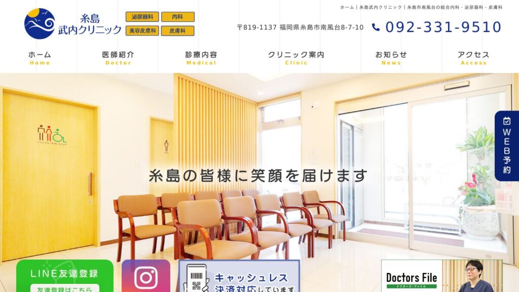 糸島武内クリニックでは、顔のエラ部分へのボツリヌストキシン注射による施術を提供しております。施術に際しましては、医師が患者様お一人おひとりの状態を丁寧に確認し、ご納得いただけるまでご相談に応じる体制を整えております。ご予約は完全予約制となっており、オンラインからの受付も可能ですので、ご都合に合わせてご利用いただけます。また、プライバシーに配慮した環境で対応しておりますので、安心してご来院ください。アクセスは、筑前前原駅より徒歩4分、美咲が丘駅より徒歩5分でございます。