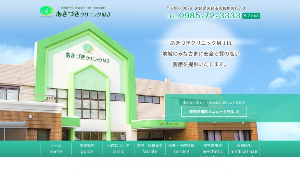 あきづきクリニックMJでは、顔のエラ部分へのボトックス注射によるケアを提供しております。施術に際しましては、専門の知識を持つ医師が事前に丁寧なカウンセリングを行い、ご希望や状態について詳しくお伺いし、ご納得いただいた上で進めてまいりますので、ご相談だけでもお気軽にお立ち寄りください。ご予約はオンラインでも受け付けており、完全予約制となっておりますので、待ち時間を少なく、落ち着いた環境でご利用いただけます。また、プライバシーに配慮した空間で対応しておりますので、安心してご来院いただけます。同クリニックへのアクセスは、宮崎駅より徒歩1分と便利な場所にございます。エラボトックスの料金は32,100円でご案内しております。
